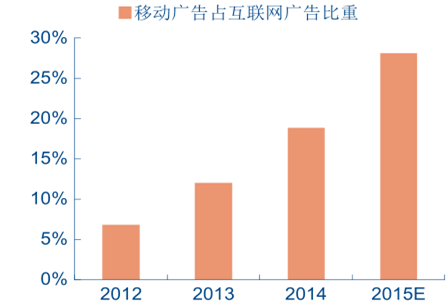 2015 年移動(dòng)廣告占網(wǎng)絡(luò)廣告比重 28%
