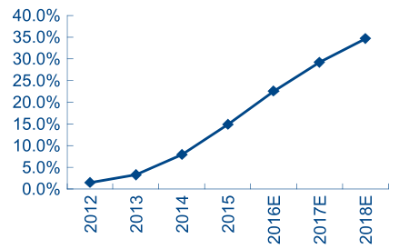 2015 年我國(guó)程序化購(gòu)買(mǎi)收入規(guī)模突破 100 億元,同比增長(zhǎng) 137.8%,成為營(yíng)銷(xiāo)領(lǐng)域中增長(zhǎng)最快的細(xì)分領(lǐng)域。盡管程序化購(gòu)買(mǎi)的規(guī)模增長(zhǎng)非常迅速,但其占國(guó)內(nèi)展示類廣告比重僅為 14.9%;相較于程序化購(gòu)買(mǎi)市場(chǎng)相對(duì)成熟的美國(guó) 59%的滲透率,從比重上看,我國(guó)程序化購(gòu)買(mǎi)的市場(chǎng)規(guī)模至少有 4 倍成長(zhǎng)空間。根據(jù)美國(guó)市場(chǎng)的成長(zhǎng)路徑分析,我們預(yù)計(jì)到2018 年,我國(guó)程序化購(gòu)買(mǎi)市場(chǎng)規(guī)模有望突破 450 億元,占展示廣告整體市場(chǎng)的比重上升到35%。