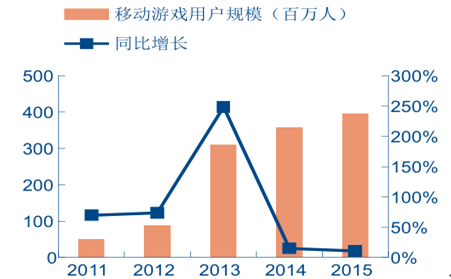2011-2015 年中國手游用戶規模及增速