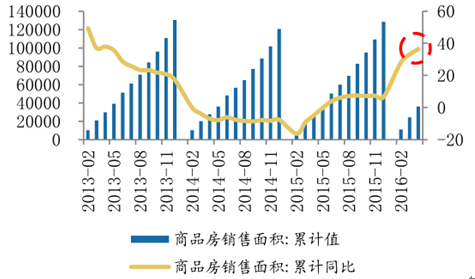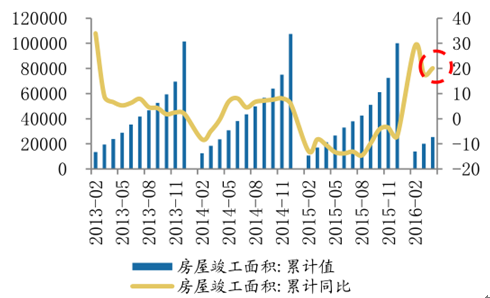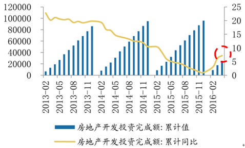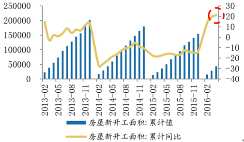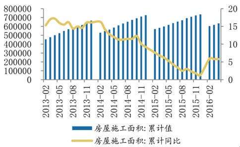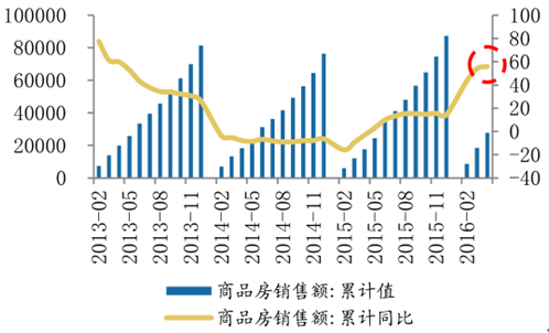 房地產(chǎn)開(kāi)發(fā)投資額增速2016年年初自?xún)赡甓嘁詠?lái)首次開(kāi)始回升, 4月累計(jì)增速回升到7.20%,連續(xù)數(shù)月反彈。房地產(chǎn)去庫(kù)存是2016年政府的重點(diǎn)工作,政策層面各級(jí)政府也出臺(tái)了多項(xiàng)政策鼓勵(lì)投資者買(mǎi)房。政策的效果也比較明顯,商品房銷(xiāo)售面積和銷(xiāo)售額4月累計(jì)增速高達(dá)36.50%和55.90%,回到2013年的水平。