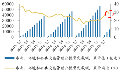 水利、環(huán)境和公共設(shè)施管理業(yè)投資增速持續(xù)上行,前四月累計(jì)增速為27.77%,較前三月有所下滑。國(guó)家近幾年大力建設(shè)水利項(xiàng)目以補(bǔ)十一五舊賬、2016年國(guó)家明確提出地下管廊建設(shè)目標(biāo)以及海綿城市政策加碼都對(duì)其產(chǎn)生了積極影響,預(yù)計(jì)高增長(zhǎng)勢(shì)頭仍將持續(xù)。電力熱力、燃?xì)饧八纳a(chǎn)和供應(yīng)業(yè)前四月投資增速為23.75%,平穩(wěn)上升;十三五期間國(guó)家會(huì)大力推進(jìn)清潔能源的建設(shè),例如核電、風(fēng)電,但這部分增量能否對(duì)沖傳統(tǒng)火電、水電項(xiàng)目的減少仍需觀(guān)察。