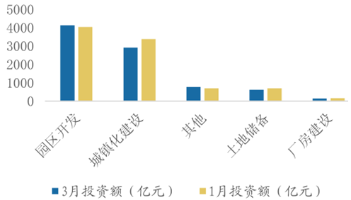3 月末與1 月末片區(qū)開(kāi)發(fā)類(lèi)PPP項(xiàng)目投資額對(duì)比