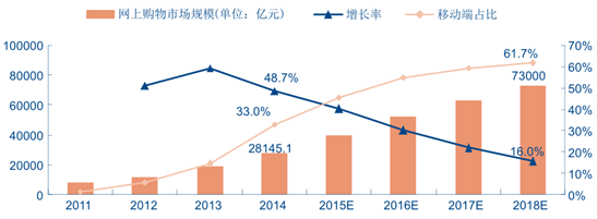 中國(guó)網(wǎng)上購(gòu)物市場(chǎng)規(guī)模(單位:億元)及移動(dòng)端占比