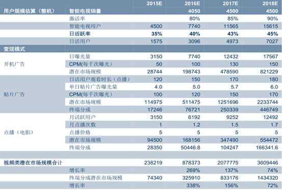 2016 年整個(gè)電視互聯(lián)網(wǎng)生態(tài)近 將產(chǎn)生接近 90 億潛在市場(chǎng)價(jià)值,終端平臺(tái)分成潛在規(guī)模超過(guò) 30 億。預(yù)計(jì)視頻生態(tài)將率先成熟,開機(jī)廣告、貼片廣告、視頻點(diǎn)播等是目前已經(jīng)成型的變現(xiàn)手段,2018 年將產(chǎn)生超過(guò)300 億潛在價(jià)值。考慮到貨幣化進(jìn)度及產(chǎn)業(yè)初期較高的交易成本,預(yù)計(jì) 2016 年龍頭用戶平臺(tái)運(yùn)營(yíng)收入規(guī)模在 2-3 億元左右,向上游內(nèi)容及服務(wù)業(yè)務(wù)拓展的龍頭公司(如 TCL 集團(tuán)旗下全球播、歡網(wǎng)科技)將收獲更多電視互聯(lián)網(wǎng)生態(tài)價(jià)值。
