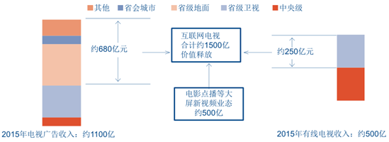 時(shí)間平均每天看傳統(tǒng)電視直播時(shí)長(zhǎng)每天看互聯(lián)網(wǎng)電視節(jié)目時(shí)長(zhǎng)20123小時(shí)2小時(shí)20132.5小時(shí)2.5小時(shí)20142小時(shí)3小時(shí)20151~1.5小時(shí)3.5~4小時(shí)2015 年廣電體系的電視廣告規(guī)模接近 1100 億元,其中中央級(jí)電視臺(tái)、省級(jí)衛(wèi)視的內(nèi)容與收視率競(jìng)爭(zhēng)力依然較強(qiáng),而省級(jí)地面電視臺(tái)、省會(huì)城市及其他地市級(jí)電視臺(tái)的競(jìng)爭(zhēng)力持續(xù)下降,該部分占比達(dá)到 62%,也即有 680 億元的廣告價(jià)值將開始以開機(jī)廣告、視頻貼片廣告的形式向互聯(lián)網(wǎng)電視轉(zhuǎn)移。2)傳統(tǒng)有線電視收視費(fèi)的轉(zhuǎn)移:2015 年,有線電視收視費(fèi)規(guī)模超過(guò) 500億元,假設(shè)中期有一半向互聯(lián)網(wǎng)電視轉(zhuǎn)移,對(duì)應(yīng)約 250 億市場(chǎng)價(jià)值。