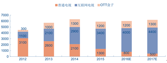 2012-2017 年中國(guó)電視終端銷量對(duì)比