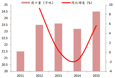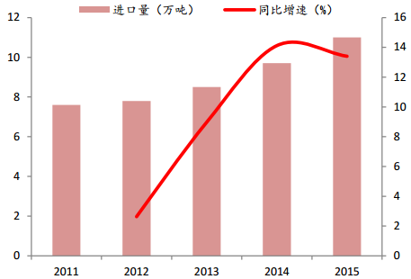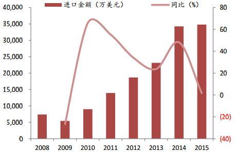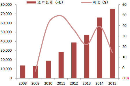 2008-2015 年奶酪進口量 CAGR 達 24.83%