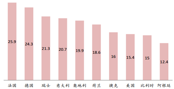 全球增速平穩,歐美為主要生產和消費國:目前全球的奶酪產量和消費量接近 2000 萬噸,近十年仍能基本保持每年小幅增長,其中 2015 年全球奶酪的產量為 1879.7 萬噸,同比增長 1.74%;奶酪消費量為 1986.5萬噸,同比增長 1.49%。歐盟地區、美國和俄羅斯是最主要的奶酪生產和消費國,歐盟地區占據全球奶酪生產和消費量的 50%左右,美國和俄羅斯的奶酪消費量分別占全球的 28%和 5%。在人均消費量方面,以法國、德國和瑞士為主的歐洲國家處于全球領先地位,美國和阿根廷為人均奶酪消費量排名前十中僅有的兩個非歐洲國家,其中法國人年均消費量為 25.9kg,德國和瑞士分別為 24.3 kg 和 21.3 kg,位于全球人均奶酪消費的前三位。