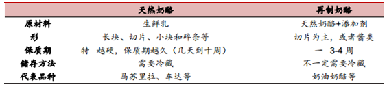 天然奶酪和再制奶酪構成奶酪的兩大類別:按照制作工藝的不同,奶酪可以分為天然奶酪和再制奶酪兩大類別。所謂天然奶酪,是指由生鮮乳直接發酵而成;而再制奶酪則以天然奶酪為原材料,再添加一些人工物質來改變其狀態。美國 FDA 規定,再制奶酪的原料至少 51%是天然奶酪,剩下的不到 49%的成分里,有添加劑,有水,也有其他奶類原料,比如奶粉,無水奶油和乳清成分。再制奶酪解決了天然奶酪受熱融化時水油分層的問題,同時豐富了奶酪的口味和可涂抹性,延長了奶酪的保質期限。