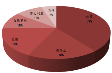 2015 年日本進口奶酪 24.5 萬噸,約占全球進口貿易總量的 22%,超過美國、俄羅斯等傳統奶酪消費國,位居第一位。同時 2011 年以來韓國每年的進口奶酪數量同比增速穩步提升,基本保持 10%以上的增速。2015 年韓國的奶酪進口量達到 11 萬噸,同比增長13.40%,約占全球奶酪進口量的 10%。2015 年中國奶酪進口量達到 7.56萬噸,同比增長近 15%。而歐盟、新西蘭和美國為最主要的奶酪出口國或地區,2015 年的奶酪出口量分別占全球總量的 39%、18%和 18%。