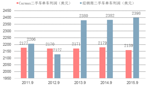 Carmax 與經銷商單車毛利潤對比(美元)