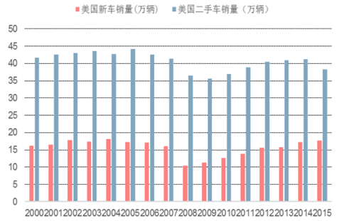 自 1990 年,美國二手車的年銷量就穩定在 4000-4500 萬之間,是新車銷量的三倍左右,而平均每輛二手車價格大約為 1.65 萬美元左右,則每年的二手車市場空間大約有 6000-7000 億美元。美國新車與二手車的銷售量