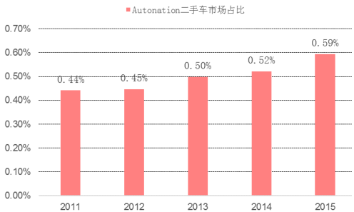 全美有 16545 家汽車經銷商,其中最大的是 AutoNation,其業務包括新車銷售、二手車銷售、零件和服務、金融/保險凈額,以及其他業務等。AutoNation 二手車銷售業務,15 年銷售額為 47 億美元,銷售車輛 221790 輛,占據整個二手車市場份額為 0.4%—0.5%,汽經銷商行業集中度較低,很分散。