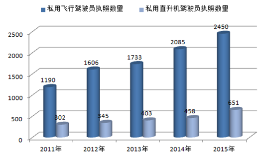2011-2015年中國民航私用駕駛員執(zhí)照數(shù)量趨勢圖