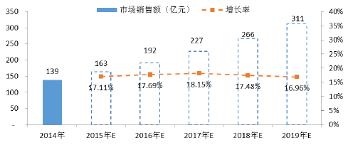 以2014 年的139 億元為基數,預計至2019 年我國骨科植入類醫(yī)用耗材市場銷售額在267 易元至352 億元之間。根據德爾菲法判斷,合理增長值為311億元五年復合增長率為17.57%。