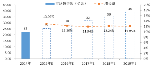 以2014 年的22 億元為基數,預計至2019 年神經外科類植入性耗材市場銷售額在36 億元至44 億元之間。根據德爾菲法判斷,合理增長值為40 億元,五年復合增長率為12.13%。