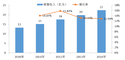 2010 至2014 年,神經外科類植入性耗材市場的銷售收入由13 億元增長至22 億元,復合增長率為13.99%。