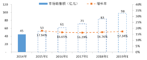 以2014 年的45 億元為基數,預計至2019 年創(chuàng)傷植入類耗材市場銷售額在83 億元至105 億元之間。根據德爾菲法判斷,合理增長值為98 億元,五年復合增長率為16.76%。
