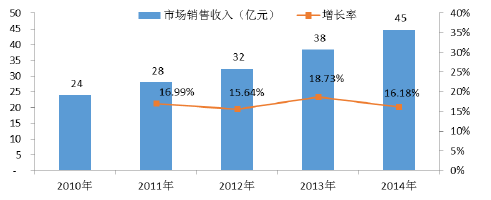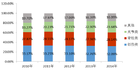 2010 至2014 年,創(chuàng)傷植入類耗材市場的銷售收入由24 億元增長至45 億元,復合增長率為16.88%,略低于骨科植入類耗材市場的整體增速。創(chuàng)傷類相關產品的生產技術相對成熟,市場開發(fā)較充分,是我國骨科植入類醫(yī)用耗材市場最大的細分類別。