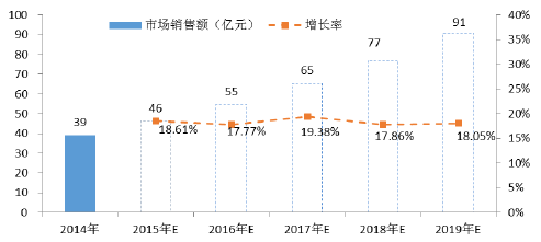 以2014 年的39 億元為基數,預計至2019 年脊柱植入類耗材市場銷售額在71 億元至99 億元之間。根據德爾菲法判斷,合理增長值為91 億元,五年復合增長率為18.26%。