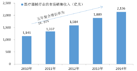 近幾年,隨著經濟發(fā)展和我國居民醫(yī)療消費的增長,我國醫(yī)療器械工業(yè)銷售收入也保持較快增長。我國醫(yī)療器械市場工業(yè)銷售收入由2010 年的1,141億元上升至2014年的2,136億元,復合增長率達到16.97%。預計未來5 年我國醫(yī)療器械行業(yè)將保持較快的增長速度。