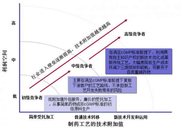 在醫藥CMO 行業中,根據技術水平及利潤空間情況存在著如下的市場格局: