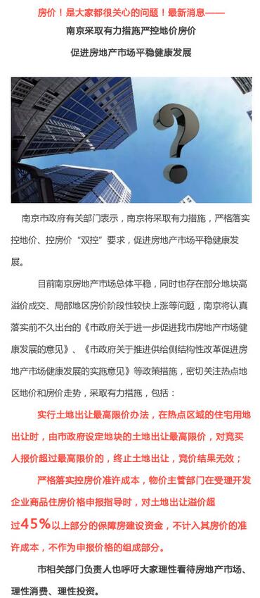 “南京發布”稱,南京市政府有關部門表示,將嚴格落實控地價、控房價“雙控”要求,促進房地產市場平穩健康發展。