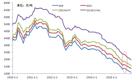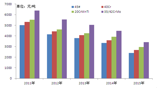 2015年結構鋼品種全年呈現單邊下跌行情,只有8月份出現了不足百元的反彈行情,全年最低價出現在年底。結構鋼各品種年度最高價45#2928元/噸,40Cr3234元/噸,20CrMnTi3625元/噸,35/42CrMo4050元/噸,年度最低價45#1991元/噸,40Cr2273元/噸,20CrMnTi2460元/噸,35/42CrMo2877元/噸。2015年結構鋼各品種跌幅,45#937元/噸,40Cr961元/噸,20CrMnTi1165元/噸,35/42CrMo1173元/噸。近三年結構鋼價格重心不斷下移,同時年度跌幅不斷加大。