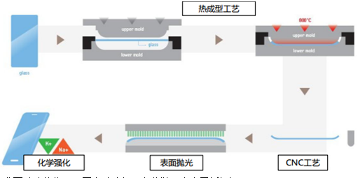 曲面玻璃(曲面)玻璃蓋板的工藝流程與傳統(tǒng)2D玻璃蓋板的加工工藝流程基本一致,但成型(Forming)過程更加復(fù)雜。有3種工藝可以實(shí)現(xiàn)曲面玻璃蓋板的制備:
