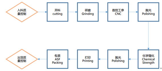 玻璃蓋板加工過程有多步復(fù)雜的勞動密集型工序。 整體而言,玻璃蓋板加工需要四層工序:成型(Forming)、化學(xué)強(qiáng)化(Chemical Strength)、清潔(Washing)和涂層(Coating),進(jìn)一步細(xì)化可以分為開料、 研磨、CNC、拋光、化學(xué)強(qiáng)化、清洗、絲印和ASF包裝等多道子工序。