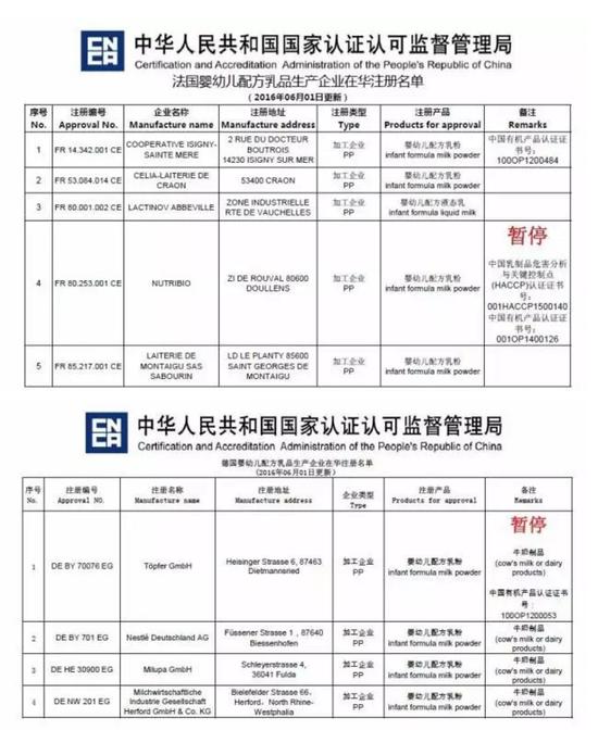 今天,負(fù)責(zé)中國(guó)進(jìn)出口食品境外生產(chǎn)企業(yè)注冊(cè)的中國(guó)國(guó)家認(rèn)證認(rèn)可監(jiān)督管理委員會(huì)(下稱“認(rèn)監(jiān)委”)再度出手,更新了德國(guó)和法國(guó)的嬰幼兒配方奶粉注冊(cè)企業(yè)名單,再多2家企業(yè)被暫停資格,分別涉及特福芬、安吉蘭德兩大有機(jī)奶粉品牌的生產(chǎn)企業(yè)。