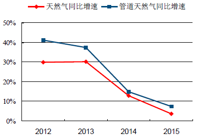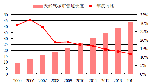 我國(guó)天然氣消費(fèi)集中于沿海及中部人口密集、經(jīng)濟(jì)發(fā)達(dá)的地區(qū),而天然氣供應(yīng)主要集中于中西部地區(qū)及領(lǐng)海。自2004年以來(lái),天然氣管網(wǎng)建設(shè)一直處在高峰建設(shè)階段,目前初步形成了“西氣東輸、海氣登陸、就近供應(yīng)”的供氣格局。2015年全國(guó)天然氣城市管道共43.46萬(wàn)公里,十年復(fù)合增長(zhǎng)率19.8%。