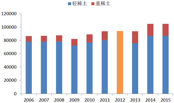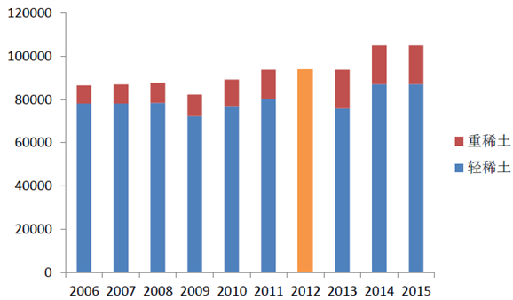 1、2006年以來,我國稀土氧化物開采指標總體保持相對穩(wěn)定,2015年達到了10.5萬噸,其中輕稀土8.7萬噸,重稀土為1.8萬噸。