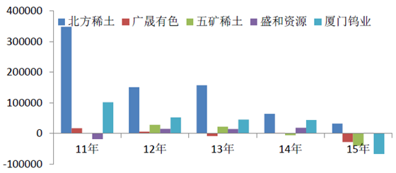 稀土價格的連年持續(xù)下跌,使得稀土行業(yè)企業(yè)的盈利能力大受影響。2011年至今,稀土行業(yè)上市公司的盈利能力持續(xù)下降,2015年,5家上市公司的歸母凈利潤同比均大幅下降,除北方稀土和盛和資源仍有盈利外,其余3家均處虧損或接近虧損狀態(tài)。