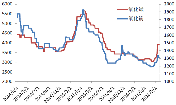 2、2016年3月30日,國家發(fā)展改革委會同有關部門組織召開了稀土企業(yè)商業(yè)儲備動員大會,會議明確了稀土商業(yè)儲備的原則、配套措施、實施主體、運行模式、具體方案和進程,標志著稀土行業(yè)企業(yè)層面的供給側(cè)結(jié)構(gòu)性改革進入實質(zhì)性攻堅階段。受稀土收儲政策的影響,稀土價格出現(xiàn)一定幅度的反彈。氧化鏑和氧化鐠釹價格近期出現(xiàn)了明顯的上漲,其中氧化鏑較今年最低價上漲9.6%,氧化鐠釹較今年最低價上漲3.3%。