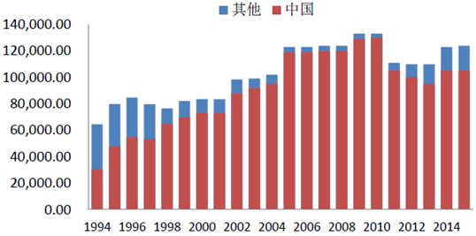 1994-2014年全球稀土產(chǎn)量