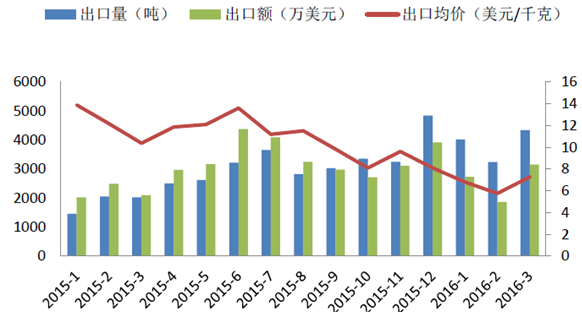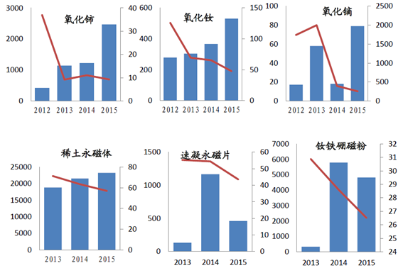 2015年以來,隨著出口配額的取消,我國稀土產(chǎn)品出口量持續(xù)增加,2016年3月月度達到出口4343噸,較2015年1月的1457噸增長198%,而出口均價卻由13.89萬元/千克降至7.26萬美元/千克,降幅達高達47.7%。