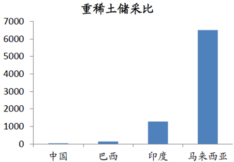 5、由于我國稀土總量基數(shù)較大,所以雖然每年生產(chǎn)量巨大,仍可以保持相對較高的儲采比,在短期內(nèi)不會產(chǎn)生資源儲量快速耗竭的壓力。但作為稀缺資源,我國重稀土的儲采比僅為31,卻遠遠小于其他國家,說明我國對重稀土的開采速度明顯過快,重稀土超采情況嚴重,亟需加強管控。