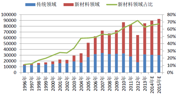 一般將稀土的應用分為兩部分:傳統(tǒng)領域應用和新材料領域應用。隨著科技進步,高新技術領域?qū)π虏牧系男枨蟛粩嘣鲩L,稀土在新材料中的應用范圍不斷拓展,用量也不斷增加。預計2015年,全國稀土消費量已經(jīng)達到9.4萬噸,同比增加3.4%,新材料領域的應用量達到6.3萬噸,占消費總量的68%。