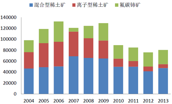2004-2013年中國各類礦產(chǎn)品REO產(chǎn)量(噸)