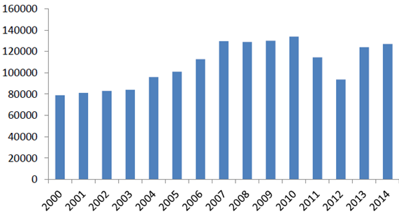 2000-2014年全球稀土氧化物消費量(噸)