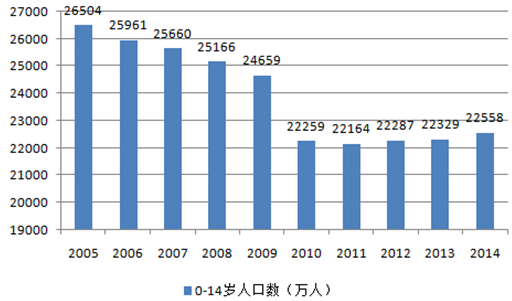 由于計劃生育的持續實施,我國0-14歲人口一直在下降,在2011年達到最低點2.22億人,然后在2012年和2013年緩慢增長,增長率為0.1%~0.5%,總人口占比也從2005年的20.27%下降到2013年的16.41%。在2013年局部開放二胎政策后,隨著新生嬰兒數量的加速增長, 2014年0-14歲人口開始加速增長,增長率達到1%,占總人口的 16.49%,占比為4年最高。我們預計,隨著新生嬰兒數規模的高速增長,我國0-14歲人口數量也將持續增長。持續增長的嬰童數量給童裝市場帶來更大的市場空間。 2014年我國0-14 歲人口為 2.26 億人,其中城市兒童約 1.24 億人,這部分人群是當前童裝消費的主力群體。