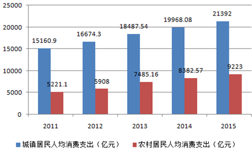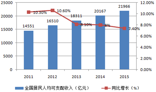 2015年全年全國居民人均可支配收入21966元,比上年增長8.9%,扣除價格因素,實際增長7.4%。按常住地分,城鎮居民人均可支配收入31195元,比上年增長8.2%,扣除價格因素實際增長6.6%。農村居民人均可支配收入11422元,比上年增長8.9%,實際增長7.5%。城鎮居民人均消費支出21392元,增長7.1%,扣除價格因素實際增長5.5%;農村居民人均消費支出9223元,增長10.0%,扣除價格因素,實際增長8.6%。隨著我國城鄉居民人均可支配收入水平不斷提高,增強的消費能力為嬰童產業的繁榮提供了保障。