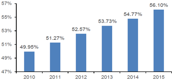 2005 年以來,我國城市化進程保持較快發展,城鎮人口數量持續增長。截至2015 年末我國城鎮人口約 7.7 億,城市化率已由 2005 年的 43%升至 56.1%。2014 年《國家新型城鎮化規劃(2014-2020 年)》提出,到 2020 年,我國常住人口城鎮化率將達到 60%左右。