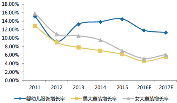由于經濟下行、需求疲軟等,目前整個服裝行業增速放緩。社會消費品零售總額仍舊延續10年以來的增速下滑勢頭,2016年一季度,社會消費品零售總額同比增長僅為9.7%,較2015年全年繼續回落0.4個百分點。在大環境需求不景氣的背景下,尤其是在成人服裝市場增長放緩,男女裝市場趨于飽和的背景下,童裝市場的快速增長顯得尤為亮眼,已成為服裝行業發展的一個新興增長領域。
