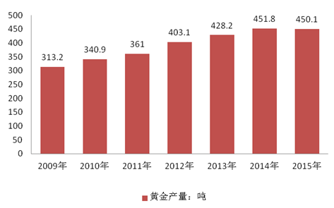 據中國黃金協會最新統計數據顯示,2015年,全國累計生產黃金450.053噸,與2014年同期相比,黃金產量減少1.746噸,同比下降0.39%。其中,黃金礦產金完成379.423噸,有色副產金完成70.630噸。中國黃金、紫金礦業、山東黃金、山東招金等大型黃金企業集團黃金成品金產量和礦產金產量分別占全國的49.06%和44.38%。