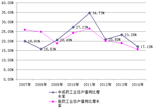 年份2007年2008年2009年2010年2011年2012年2013年2014年中成藥工業總產值(億元)14721705205426143522425352426141同比增長率19.91%15.83%20.49%27.23%34.73%20.80%23.26%17.10%受國家實施中藥現代化等因素拉動,中成藥工業總產值在 2009 年后的增速始終高于醫藥行業整體的工業總產值