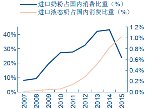 進口奶粉方面,2015 年我國進口奶粉51 萬噸左右,占國內消費量221 萬噸的23.08%,較2014年降低了19.17pcts,降幅明顯。我們認為新西蘭、澳大利亞和歐盟等地的原料優勢將會保持,目前越來越多的龍頭企業選擇走出去,進行全球資源布局,看好其未來發展。奶粉“注冊制”+跨境稅改,國內市場迎來大洗牌。奶粉市場國際品牌、國產品牌、海淘產品的市占率分別為40%、45%和15%,進口奶粉消費者偏好率高達64.2%,隨著奶粉“注冊制”的出臺,行業準入門檻提升,淘汰大批不合格產品及海外貼牌產品,預計未來中國奶粉市場將只剩下不超過600 個品牌,70%-80%的跨境電商品牌將會消失,騰挪出市場空間,利好大品牌。跨境稅改新政實施后,跨境電商奶粉價格小幅上漲,長遠看稅收增加的成本可能由電商、廠家和消費者共同承擔,線上/線下奶粉的終端價格差異縮小,而線下的服務和專業化在不斷提升,消費者有望再度回歸線下選購奶粉。未來奶粉企業間的競爭將逐漸從價格競爭、品牌競爭轉換為服務競爭。受益于“全面二胎”疊加“猴寶寶熱潮”帶來國內市場奶粉需求量增大和行業準入法規完善,我們認為經過兩年多的調整后,國內嬰幼兒奶粉行業有望走出低谷,步入復蘇期。以合生元、貝因美、皇氏集團、伊利和三元等具備優質產品、營銷實力、渠道掌控力的企業代表將引領行業發展。