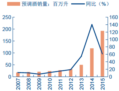 2007-2015年中國預調酒行業銷量及增速