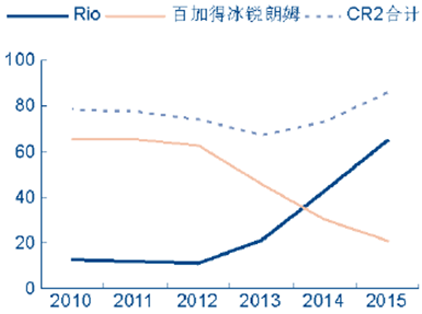 2010-2015年中國預調酒行業CR2 占比(%)
